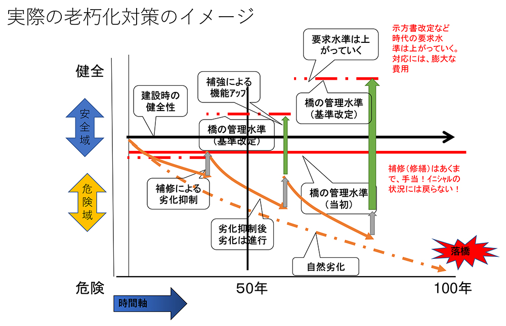 補修に関しては補修材料や補修方法の選定、補修工事の不備、手抜きもあり、理想通りにはいかない。補修・補強は、新設ではないので、新設のようなわけにはいかない。より不利な状況での施工となる。こういったことが重なり、「再劣化」は当然起きる。そして、寿命は100年あるとは限らないものを直すのだから、その辺は覚悟しておかないと、膨大な運用費の計算違いがのしかかってくるわけである。