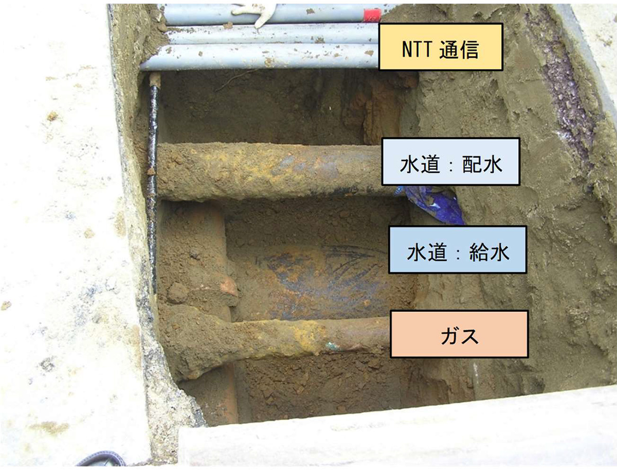 道路には、日々の生活を支える電気、通信、上下水道、ガスなどのライフラインが図‐3に示すように路面下の地中に埋設され、道路が河川や鉄道、道路を跨ぐ橋梁下の空間にも同様なライフラインが添架されている。また、道路下の地中には、開削工法やシールド工法などによって鉄道や道路が大型構築物として建設されている。道路路面下の地中に埋設されるライフライン及び地中構築物は、路上を通行する車両荷重や埋設されている地点の水圧、土圧などに耐えられるように設計され、道路構築時、若しくは供用開始後に建設されている。道路路面下に埋設されているライフラインや地中構築物の多くは、地上からその状態を確認することが困難であることから、橋梁やトンネンルとは点検方法が異なっている。