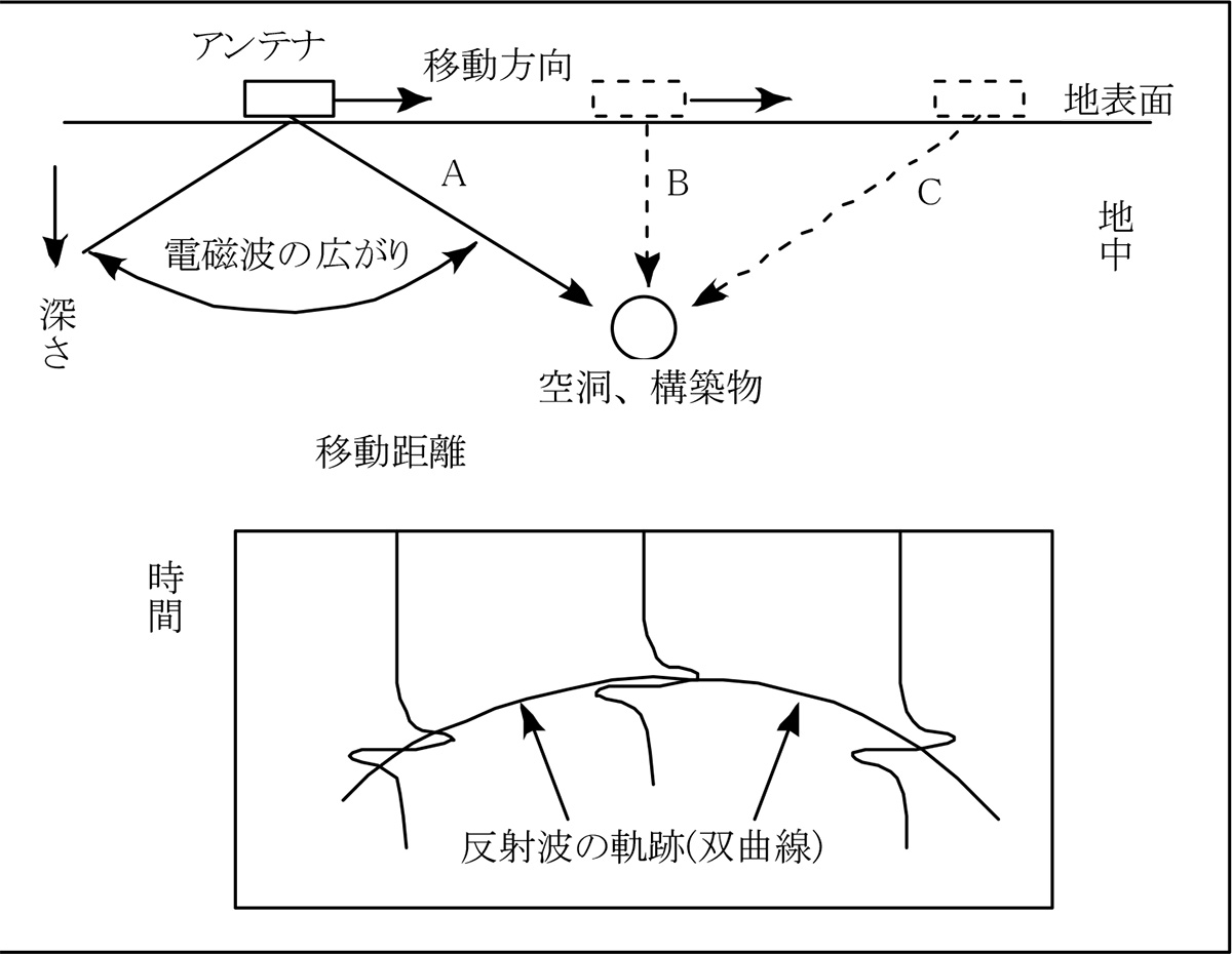 そもそも電磁波は、比誘電率の違う物質との境界層で反射・透過する性質を持ち『比誘電率が高い物質から低い物質』、『比誘電率が低い物質から高い物質』では反射波の位相が逆になる。また、空気は、舗装材料や埋設物に比べて比誘電率が低いため、層の境界等による反射波と空気との反射波では位相に違いが発生する。空洞探査では、この位相差を示す反射波を受信し、受信した反射波の中から空洞の可能性が高い異常信号を抽出することによって空洞と判定している。また、電磁波は空中では光と同じ速度で伝播するが、地中では土質や水分量等の電気的な状況によって速度が遅くなるため、電磁波を使って空洞の深度を特定するためには注意が必要である。