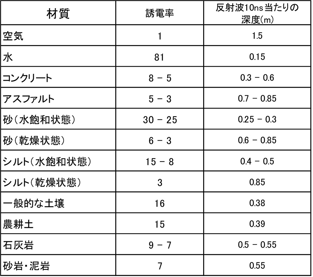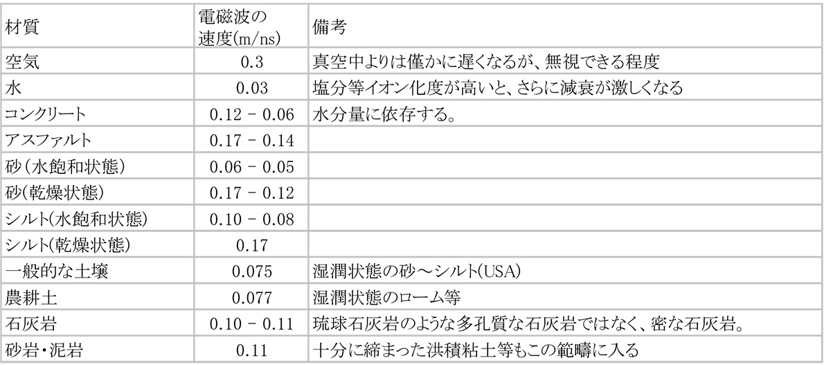 表‐1 地中に存在する主要な材質と電磁波の伝搬速度表