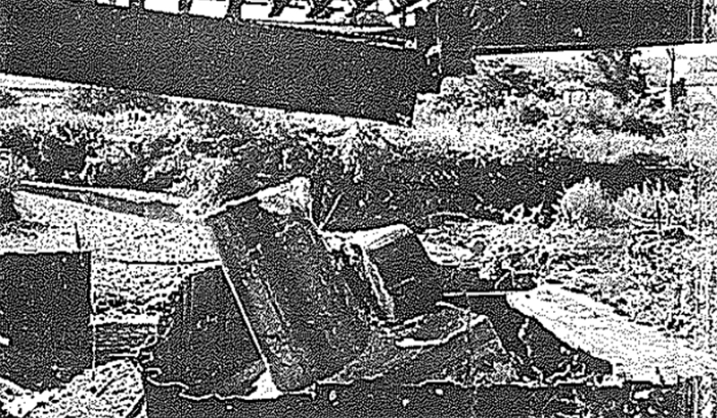 写真-6 橋脚が転倒し、桁がレールで吊るされている状況
