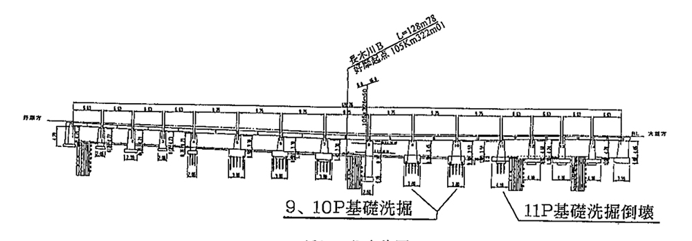 長木川は米代川の支流で、秋田県管理の一級河川です。長木川橋梁は橋長125mで、1914(大正3)年7月に建設され、この災害時で経年は83年となっていました。上部工はプレートガーダー15連(支間長6.63~9.75m)、下部工は橋台2基と、橋脚14基からなっています。図-4に橋梁側面図と被害箇所を示します。