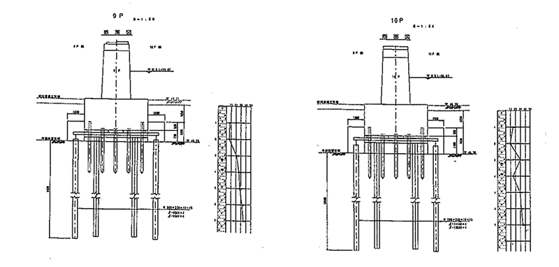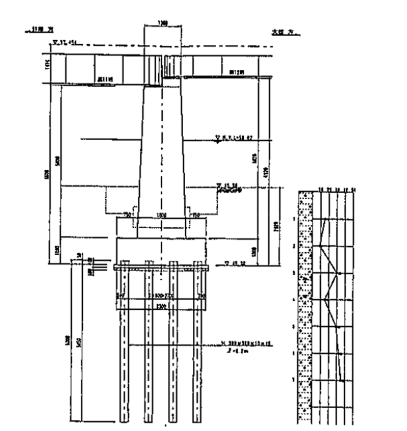 倒壊した橋脚は小割にし、路盤材として使用し、木杭はすべて引き抜きました。造りなおす橋脚はRC構造とし、杭はH形鋼を用いました。長さは今回の洗堀深さから2mの余裕を確保したものとしました(図-5)