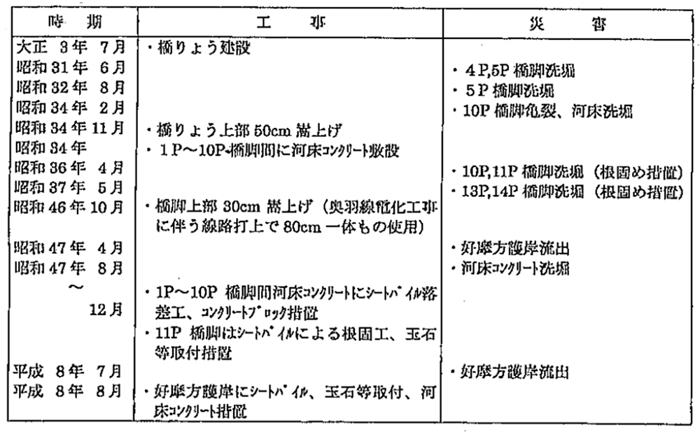 この橋梁の災害履歴を見ると表-2のようになっています。1956~1957(昭和31~32)年頃に河川中心部橋脚(4P、5P)の洗堀、1961~1962(昭和36~37)年頃の終点側の10Pから14Pの橋脚の洗堀、1972~1973(昭和47~48)年頃の起点側護岸、河床コンクリートの洗堀などに対して、種々の対策が講じられています。