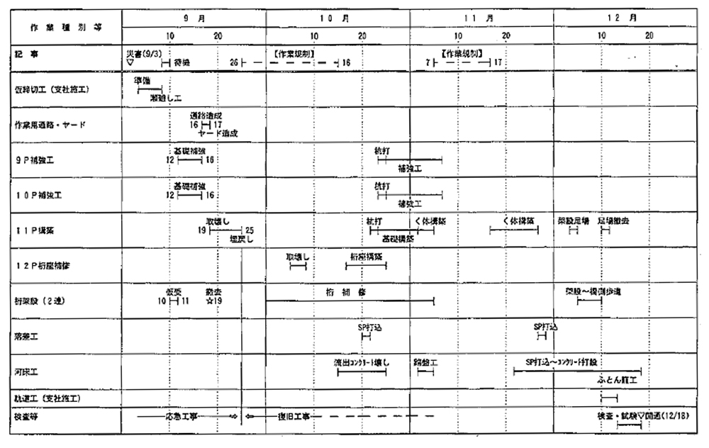 工程表を表-2に示します。1997(平成9)年12月18日(事故から106日)に、営業運転が再開されました。