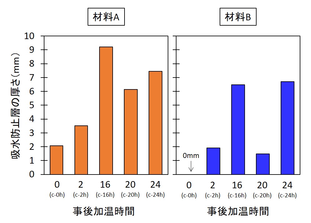 図11は事後加温時間と吸水防止層の厚さの関係を示しています。材料Aの場合、事後加温が0時間のケースは2mmであるのに対し、事後加温を16~24時間行ったケースは6~9mmで、厚さが3~4倍大きい結果となりました。材料Bは、事後加温0時間に関しては、吸水防止層が確認されませんでした。一方、記号c-20hを除くと、事後加温を16~24時間行った主桁下面では約6mmの吸水防止層が確認され、総じると、事後加温の時間が長いほど、吸水防止層の厚さは大きくなると言えます。