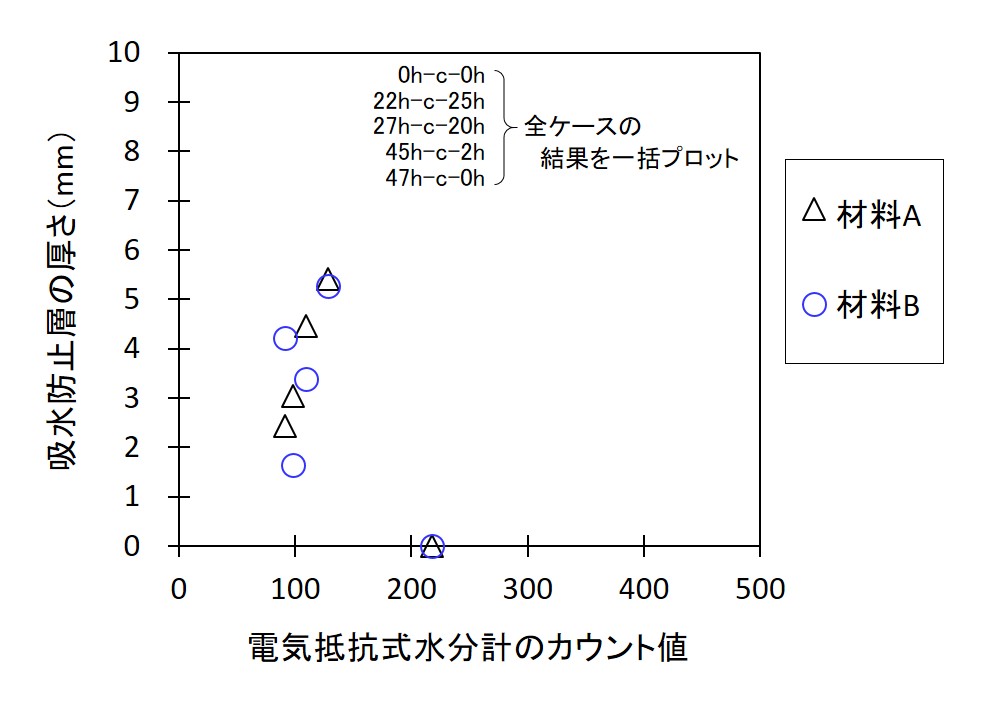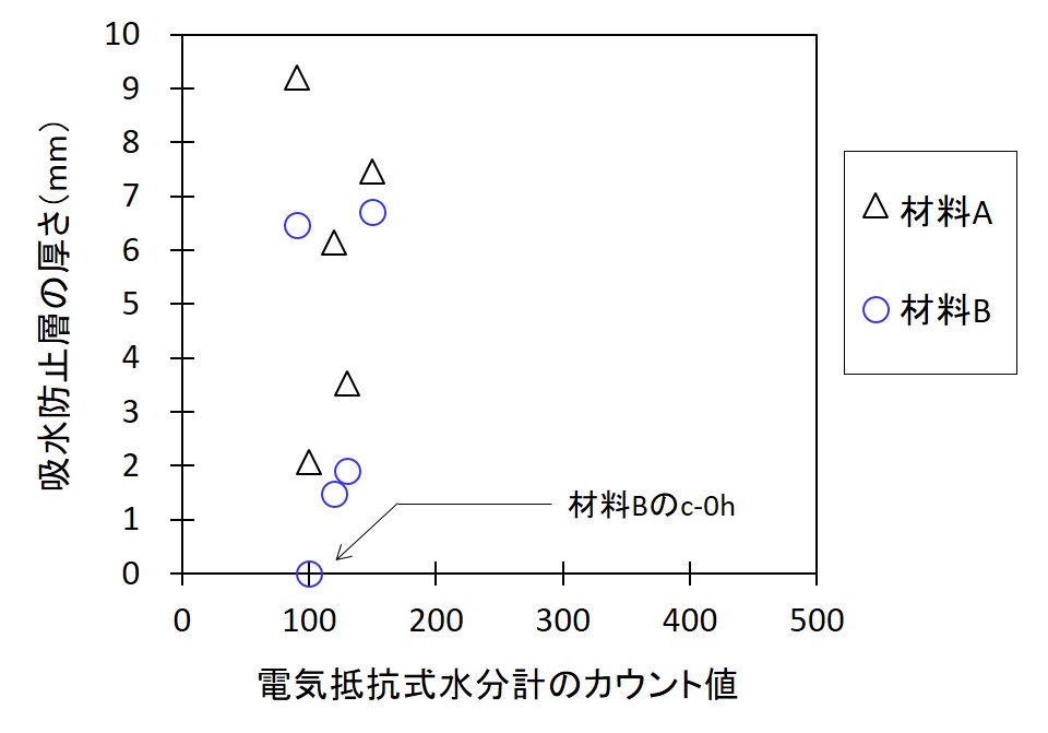 図12は塗布直前に測定した電気抵抗式水分計のカウント値と、1~2ヶ月後にコア採取によって測定した吸水防止層の厚さの関係を示しています。シリーズⅠにおいては、カウント値が約100~150の主桁下面へ塗布したケースでは、いずれも吸水防止層の形成が確認されましたが(図7)、シリーズⅡでは、事後加温を行わなかった材料Bのc-0hに関して、塗布直前のカウント値は約100であったものの、吸水防止層は確認されませんでした。