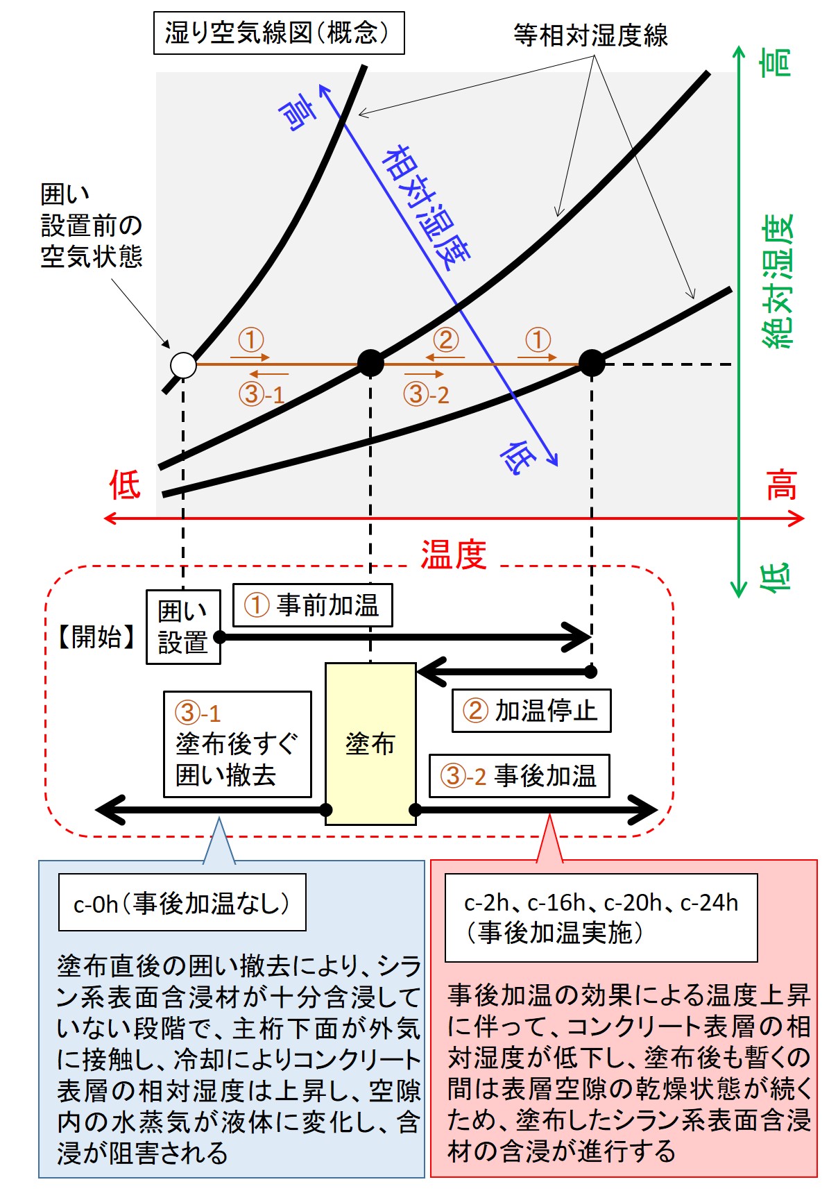 空気は、乾いた空気中に水蒸気が含まれる状態で存在しており、この状態は一般に湿り空気線図で表現されます[4]。図13は湿り空気線図を概念的に示したものです。絶対湿度が一定の場合、温度が低下すると相対湿度は高くなります。事後加温を行わなかったc-0hは、塗布直後に囲いを撤去したことで、シラン系表面含浸材が十分含浸していない段階でコンクリート主桁下面が外気と接触し、コンクリート表層の相対湿度が冷却によって上昇することで表層空隙の水蒸気が液体に変化し、シラン系表面含浸材の含浸が阻害されたことが考えられます。また、主桁直下が河川であったことも湿度上昇の要因と考えられます。