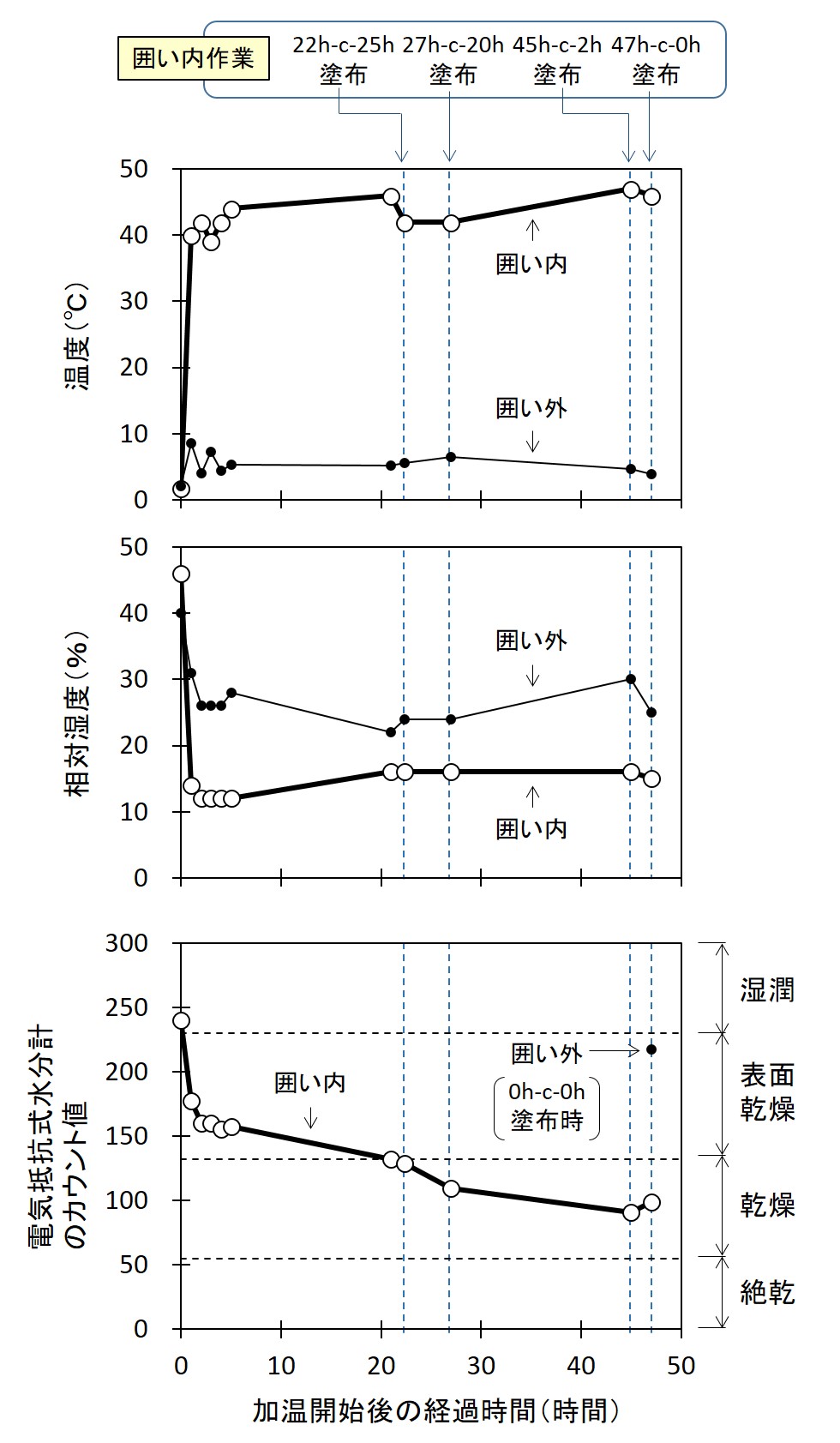 シリーズⅡを実施したときの塗布前日および当日の最低気温は、前日が1.3℃、当日が-0.3℃でした。加温時の囲い内の温度は、シリーズⅠのときと同じく約45℃でした。塗布前日の夜間に一旦、加温を停止しましたが、囲いを撤去していないこともあって、囲い内の空気は乾いた状態が持続し、塗布時のコンクリート主桁下面のカウント値は約100で、乾燥状態が保持されていました(図12)。c-0hは塗布後、事後加温を行わずに囲いを撤去していますので、シラン系表面含浸材が十分に含浸していない段階から温度低下が始まることになります。