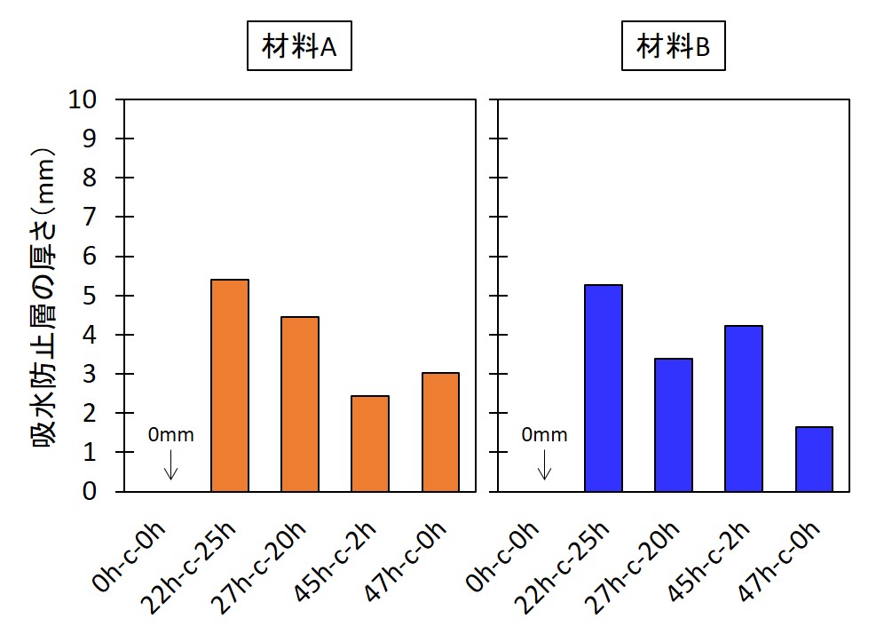 図8は各ケースの吸水防止層の厚さを棒グラフで表したものです。当初は、塗布前の加温時間(●h-c-■hの●)を長く設定し、コンクリート主桁下面の表面近傍を十分乾燥させてから塗布した方がシラン系表面含浸材は深く含浸し、厚い吸水防止層が形成されると予想していました。しかし、比較対象の無加温(0h-c-0h)を除くと、材料A、Bのいずれにおいても、塗布前の加温時間が最も短い22h-c-25hが全ケースの中で吸水防止層が最も厚く、また、塗布前の加温時間と吸水防止層の厚さが反比例するなど、予想とは異なる結果が示されました。