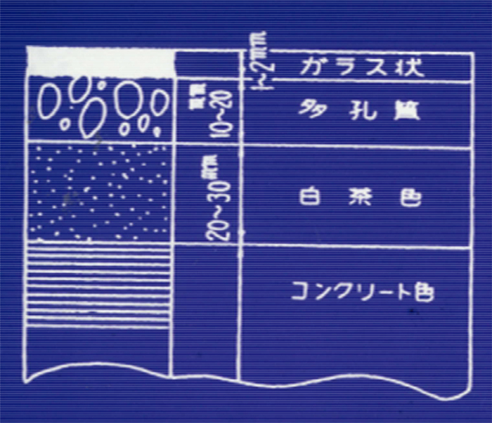 コンクリートの被災温度の調査としては、コンクリート表面部分を薄く削り、粉末にしてX線分析をしました。珪灰石を1200℃以上に熱して生成する擬珪灰石の結晶の存在から、1200℃以上に受熱したものと推定されています。