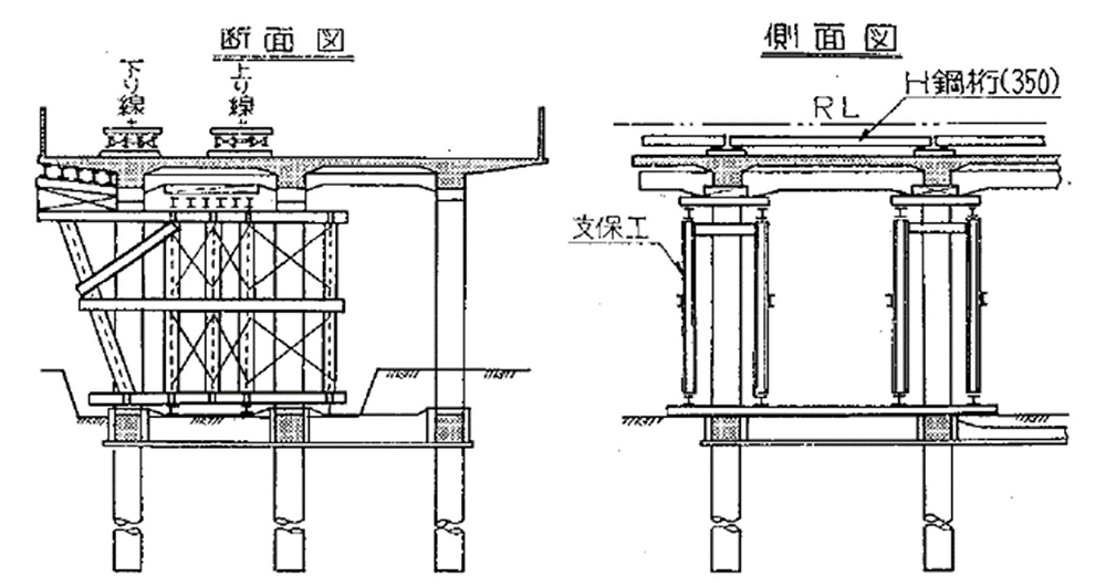 仮復旧は、スラブの下側鉄筋の重ね鉄筋が垂れ下がっている範囲は、既設のスラブの上をそのままで列車を載せられないので、横梁間にH型鋼の軌道桁を設置して、その上に列車を通すこととしました。軌道桁を支持する横梁は一時的に地上から支保工で補強する構造としました(図-3・写真-9)。