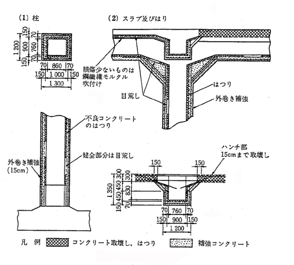 梁と柱は15㎝厚で鉄筋コンクリート巻補強を行いました。7割は既存の鉄筋で、3割を新しい鉄筋で負担するという考えで、追加の鉄筋量を決めました(図-4)。後打ちのコンクリート断面が小さく、乾燥収縮によるひび割れが心配されたので膨張材(CSA100R)を使用しました。写真-10に、柱の補修状況を示します。