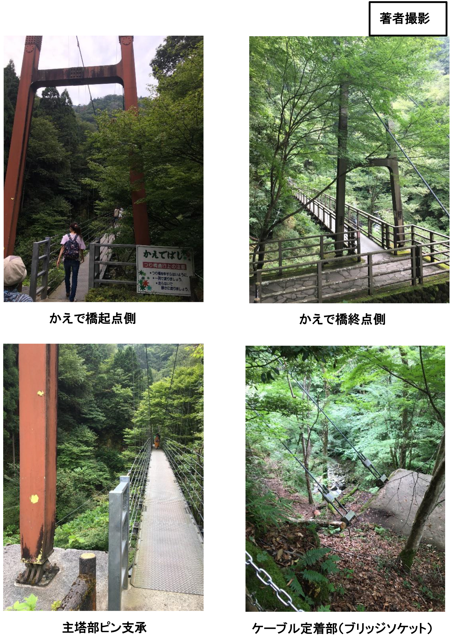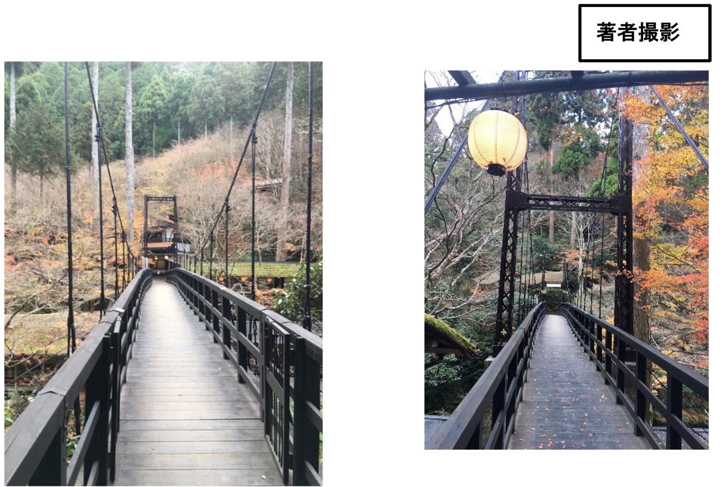 2022年12月初旬、福岡県OBで出向中にお世話になった当時の企画振興部空港対策課係長さんが京都にトレイルにやってくるという。トレイル(九州ではオルレ)とは、森林や里山などに設置された「歩くための道」のことを言う。私も九州オルレの内の三つ、佐賀県の「嬉野温泉コース」、「武雄温泉コース」、福岡県の「宗像・大島コース」をご一緒した(オルレとは、韓国・済州島の言葉で「通りから家に通じる狭い路地」と言う意味。海岸線や山などの自然、民家の路地などを歩くもの)。話を戻すと、京都には5つのトレイルコースが設定されている。そのうちの一つ、西山コースに出かけたときに見つけた人道吊橋を写真‐1に示す。清滝から嵐山(渡月橋)までの6㎞程のコースである。この途中に料亭への歩道吊橋である「もみぢばし」に遭遇した。長さは30mほどであり長くはないが、料亭用の専用吊橋であることからしっかりメンテナンスが為されていることに感心した。また、鋼製主塔の鉛直部材を繋ぐレーシングバーも凝っているなと感じた。
