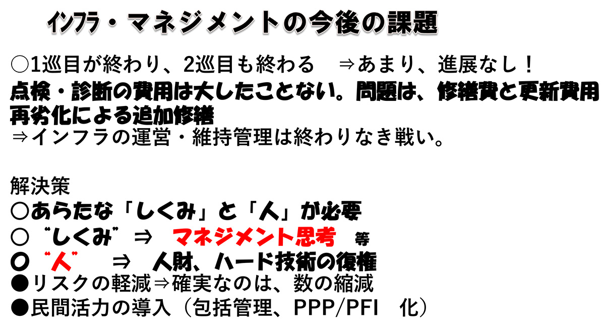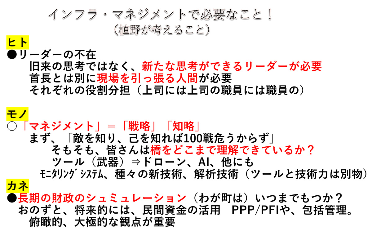4月8日のNHKスペシャルでも取り上げられたが、最近、「橋梁トリアージについて聞きたい」と言うのが増えてきた、私が10年前に唱えた時は反対もあった。少し表現がきついかな? と思いつつも危機感をあおるために、戦略的にきつい表現にした。最近は論調も変わり、「やはりトリアージは必要ですよね。」と言うことを良く言われる。私とすれば、「もう遅い」のである。すでに、10年が経過点検は3巡目、第2ステージと言われる中で、トリアージを改めてやってもね。ただし、もちろん見直しは必要である。見直しは実施している。東日本大震災において実際に、トリアージを行った、知り合いの医療関係者にその非情さと困難さを聞かされた。一番印象的だったとのは「身内や友人知人のトリアージはできない。」ということである。これをインフラに置き換えるとどうなるかと言うことも考えた。おそらく当事者たちは理解できずに反対する。それは十分わかっているので、時間をかけるしかない。ヒトの生死は時間も許さない。先日のNスペの番組中でコメンテーターが言っていたことは、耳障りの良いことで、実際の現場でも、コンサルや学識者は「合意形成」「説明責任」とは言うが、なかなか難しい。藤井市長の発言は非常にありがたかった。前の森市長同様、言い辛いところも言える方が尊敬に値する。私は勝手なことを言っても、批判だけで済む。批判されるのは若かりし頃から慣れている。しかし、市長は違う。