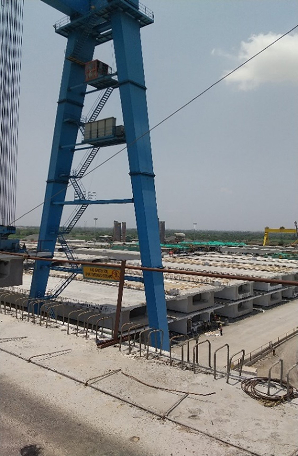 工場にて40mスパンのPC箱型桁を製作し、架設した桁上を運搬しては、次々と架設し延長を伸ばしています。写真-3は工場で、製作されたPC箱型桁が積み上げられています。