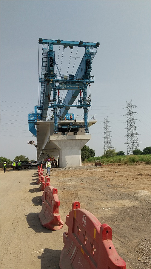 写真-4は桁の架設機です。工場から桁上を運搬した箱型桁を、この架設機を用いて順次架けていっています