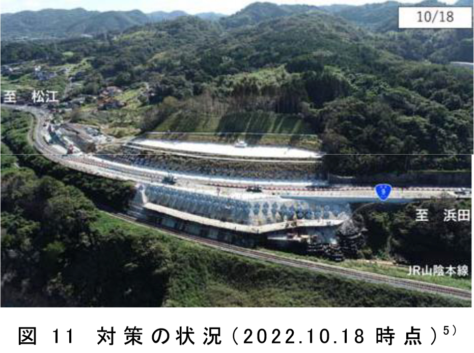 地すべりによって道路構造物に変状が現れた際に道路管理者(国土交通省松江国道事務所)から鉄道事業者(JR西日本米子支社)へ迅速に連絡が入り、山陰線小田・田儀間の列車を抑止し安全を確保しています。その後、応急対策を実施し2021(令和3)年10月1日から2022(令和4)年12月1日の間、徐行運転を行いました。