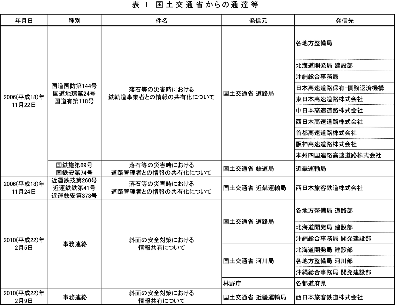 落石災害が発生した際、県道218号線の道路陥没の110番通報を受報した警察署員が現場に到着後、通行止めの措置をとりました。道路陥没の原因が不明であったため警察は道路管理者に対して連絡を行いましたが、道路管理者から鉄道事業者への連絡は行われませんでした。「もし連絡をしていれば」ということがあるかもしれませんが、この事象を教訓に表1に示すように情報共有の方法について、国土交通省鉄道局および道路局は2006(平成18)年11月22日付けで鉄軌道事業者および道路管理者に対し、鉄道と道路が近接する区間において、落石等により災害が発生した場合は、必要に応じ、関係者に情報を速やかに提供し共有化が図られるよう通達を発出しました。