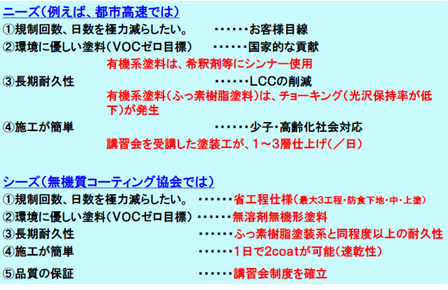 阪神高速技術㈱時代、有機系塗料メーカーに辟易していたこともあり、塗料に関する共同研究相手を探していた。そこで作成したのが塗料に求める「ニーズ」である。以下に策定した「ニーズ」と共同研究相手と決定した㈱セラアンドアース側の「シーズ」を示す。