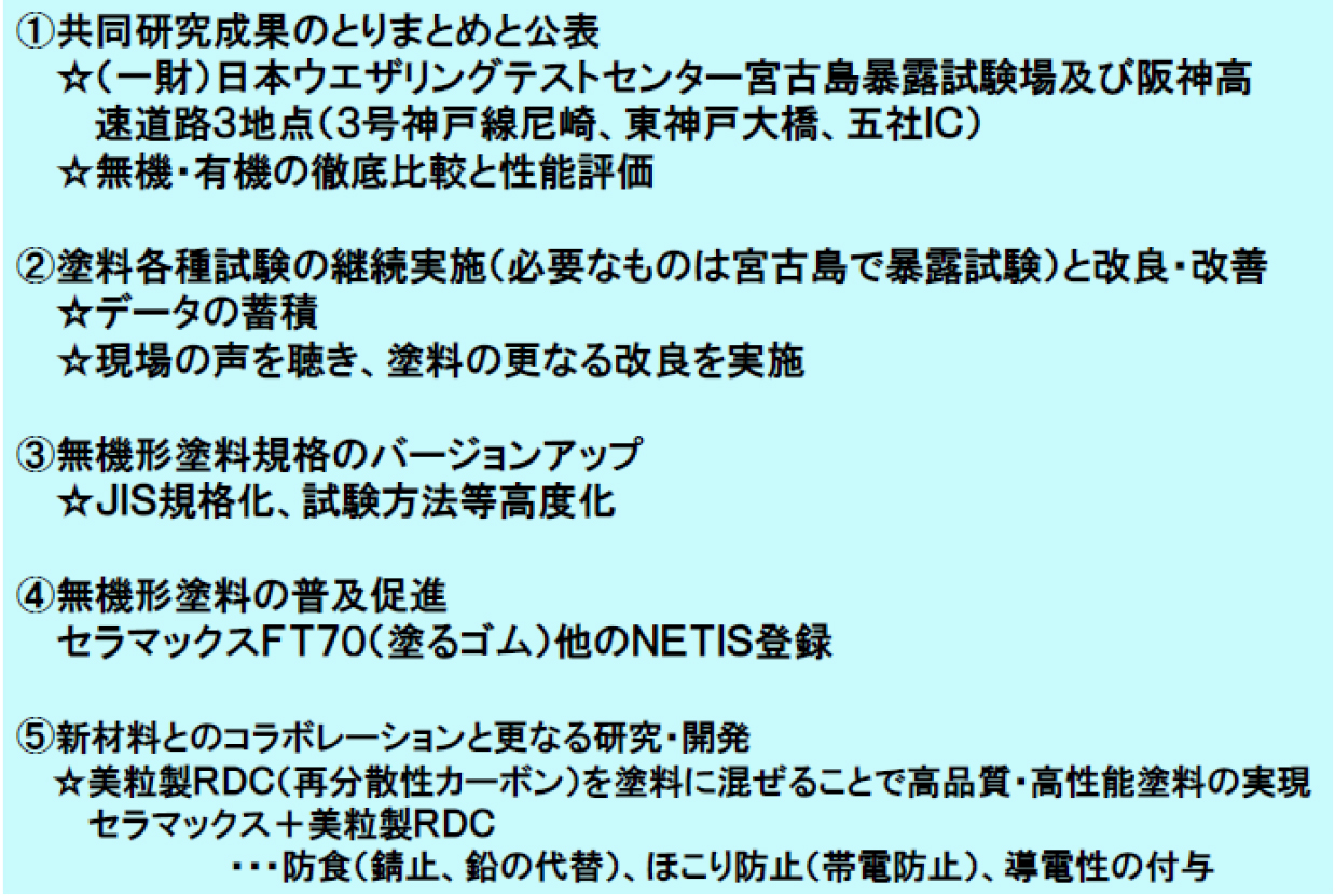 大きな目標としては、以下に示す5項目である。共同研究成果取りまとめと公表、塗料の更なる性能向上、塗料規格・基準のバージョンアップ、新規材料の普及促進、多機能塗料の開発(RDCの活用)、である。