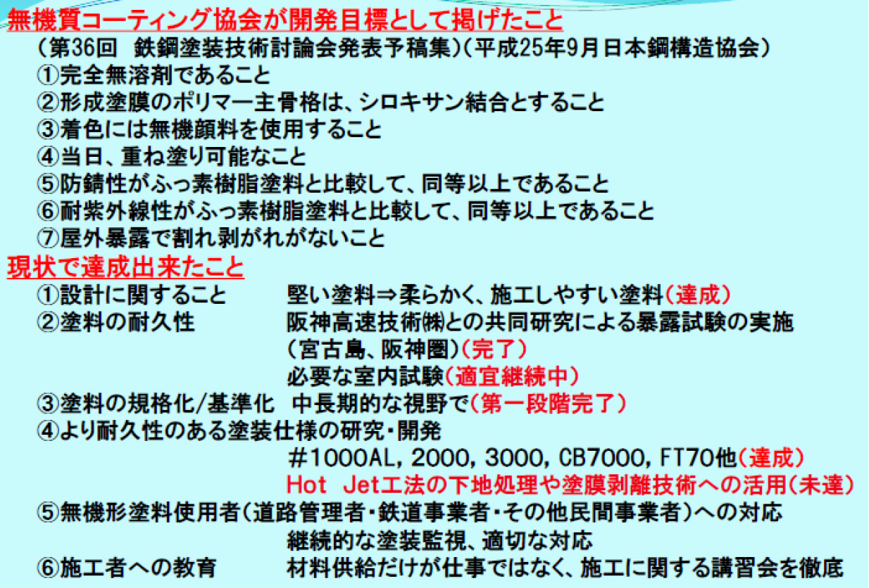 無機形塗料については、1990年代後半、本四公団早島IC近くの六間川橋の塗替塗装や神戸淡路鳴門道の淡路島内の大日川橋の塗替塗装で試験的に採用され、現時点においてもチョーキングなどは一切見られない。その後、阪神高速道路、首都高速道路、地方自治体、鉄道会社等において無機形塗料は施工されてきた。無機質コーティング協会が10年前に開発目標として掲げていた各項目について現時点では概ね達成できたと評価している。この中でも大きな柱である「塗料の規格化、基準化」について目処は立った。塗料は好き好きである。何も挑戦・トライしないのであれば有機で済ませればよい。より高耐久なものを目指すならば無機である。汗をかいて仕事をし、将来楽をするならば無機である。