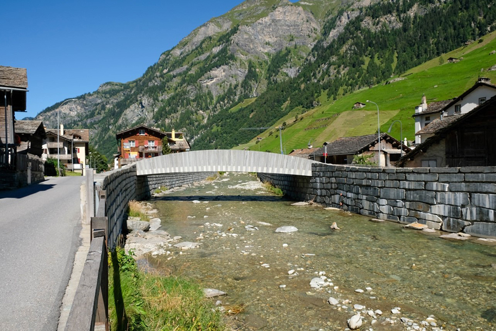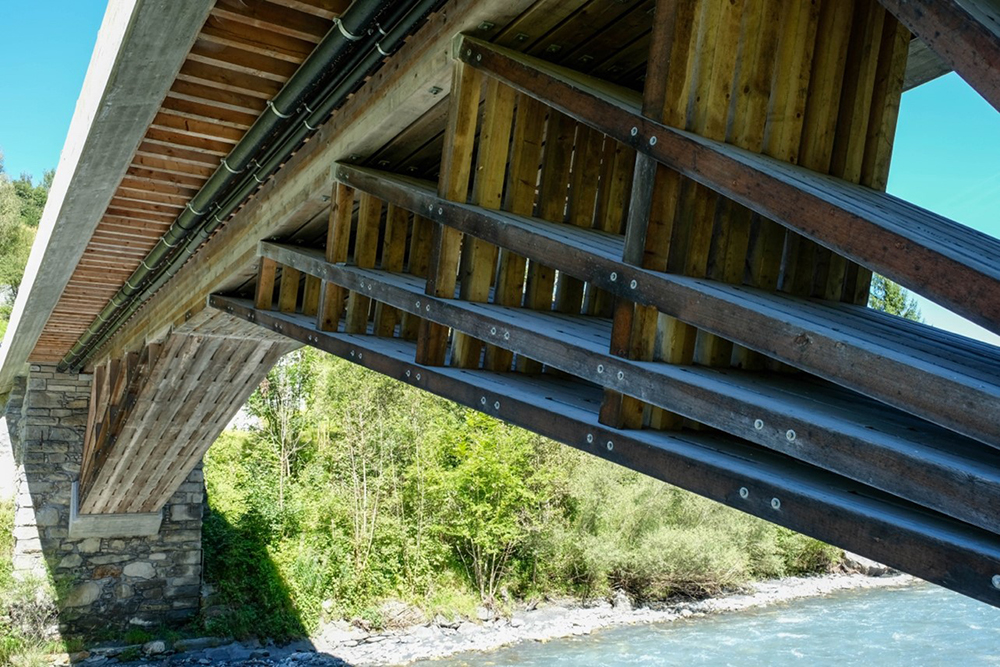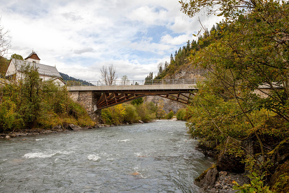 もう一つ、地場材を活用した橋を紹介します。こちらもコンツェットさんの手によるもので、クールからヴァルスに向かう道すがらのペイデンバッド(Peiden Bad)にある、グレンナー橋(Glennerbrücke in Peiden Bad)です。