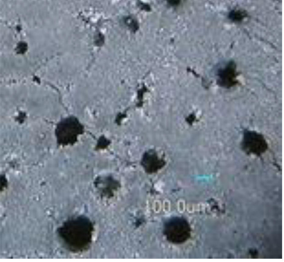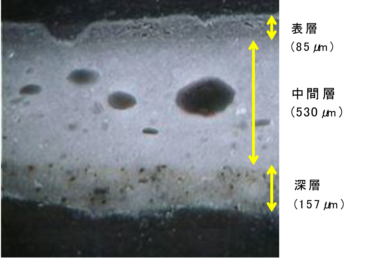 表面被覆材の表面および断面を撮影した画像を写真4、5に示します。塗膜表面には穴や微細なひび割れが認められますが、この穴が塗膜全体を貫通している可能性は小さく、ごく表層に留まっていると考えられます。