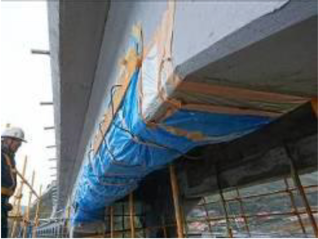 また、惣郷川橋梁に設置している風速計の2015年度冬季平均風速は4.0m/sであり、冬季の施工において強風による施工品質低下が懸念されました。そこで、施工箇所の仮設足場に防音シートを取り付けると仮設足場に風荷重が作用するため、橋梁にワイヤーロープを張り、防音シートをカーテン状に設置して施工箇所への風の進入を防ぎました。さらに、施工後直ちにシートやコンパネを使用して箇所毎に養生を行い、短期間とはいえ施工中の飛来塩分の付着を可能な限り低減することや気温低下に伴う硬化不良防止対策を行いました。