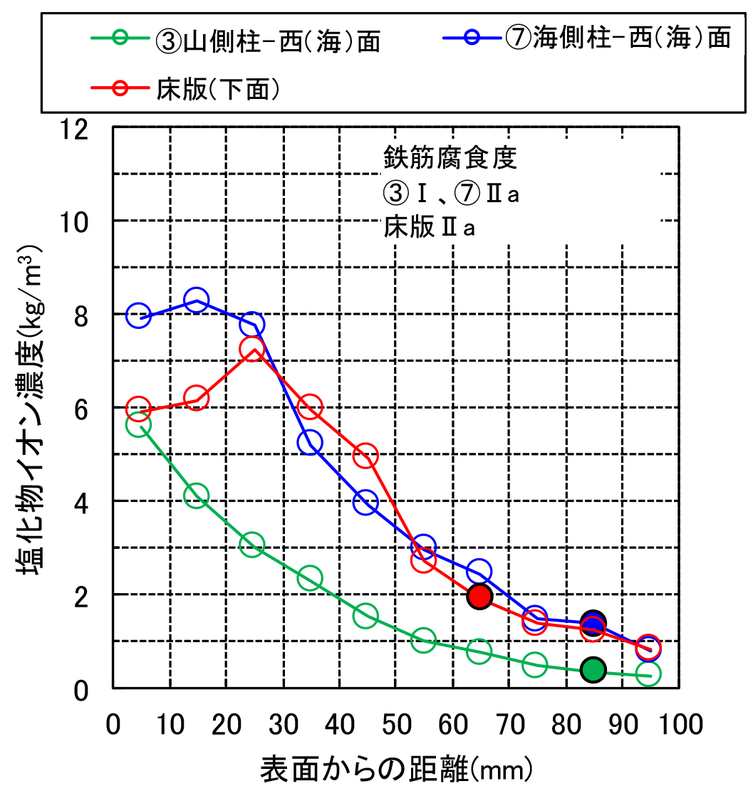 図5に、柱および床版の塩化物イオン濃度分布を示します。柱について、⑦海側柱-西(海)面は③山側柱-西(海)面よりも全ての深さにおいて塩化物イオン濃度が大きくなっています。鉄筋位置の塩化物イオン濃度(図5塗りつぶしのプロット)と鉄筋腐食度は、⑦は1.38kg/m3とⅡa、③は0.35kg/m3とⅠであり⑦の方が③よりも塩化物イオン濃度も鉄筋腐食度も大きく、塩害により腐食が促進したと考えられます。