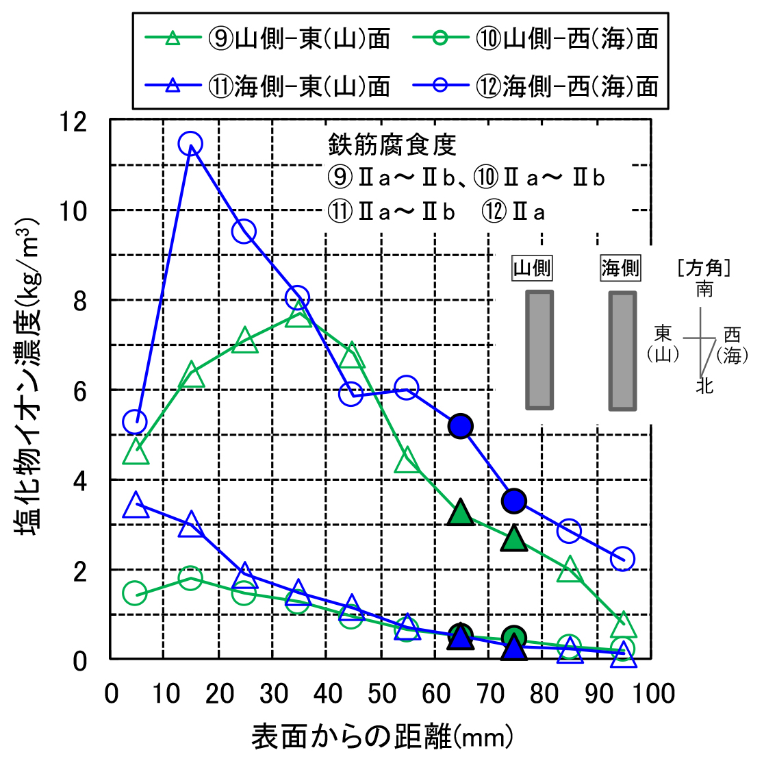 図6に、縦梁の塩化物イオン濃度分布を示します。⑫海側-西(海)面、⑨山側-東(山)面、⑪海側-東(山)面、⑩山側-西(海)面の順に塩化物イオン濃度が高い傾向にあります。これは、⑫海側-西(海)面、⑨山側-東(山)面は橋りょう外側、⑪海側-東(山)面、⑩山側-西(海)面は橋梁内側であり、波しぶきや山側からの吹き返しによる飛来塩分の供給が橋梁外側からの方が多かっためであると考えられます。