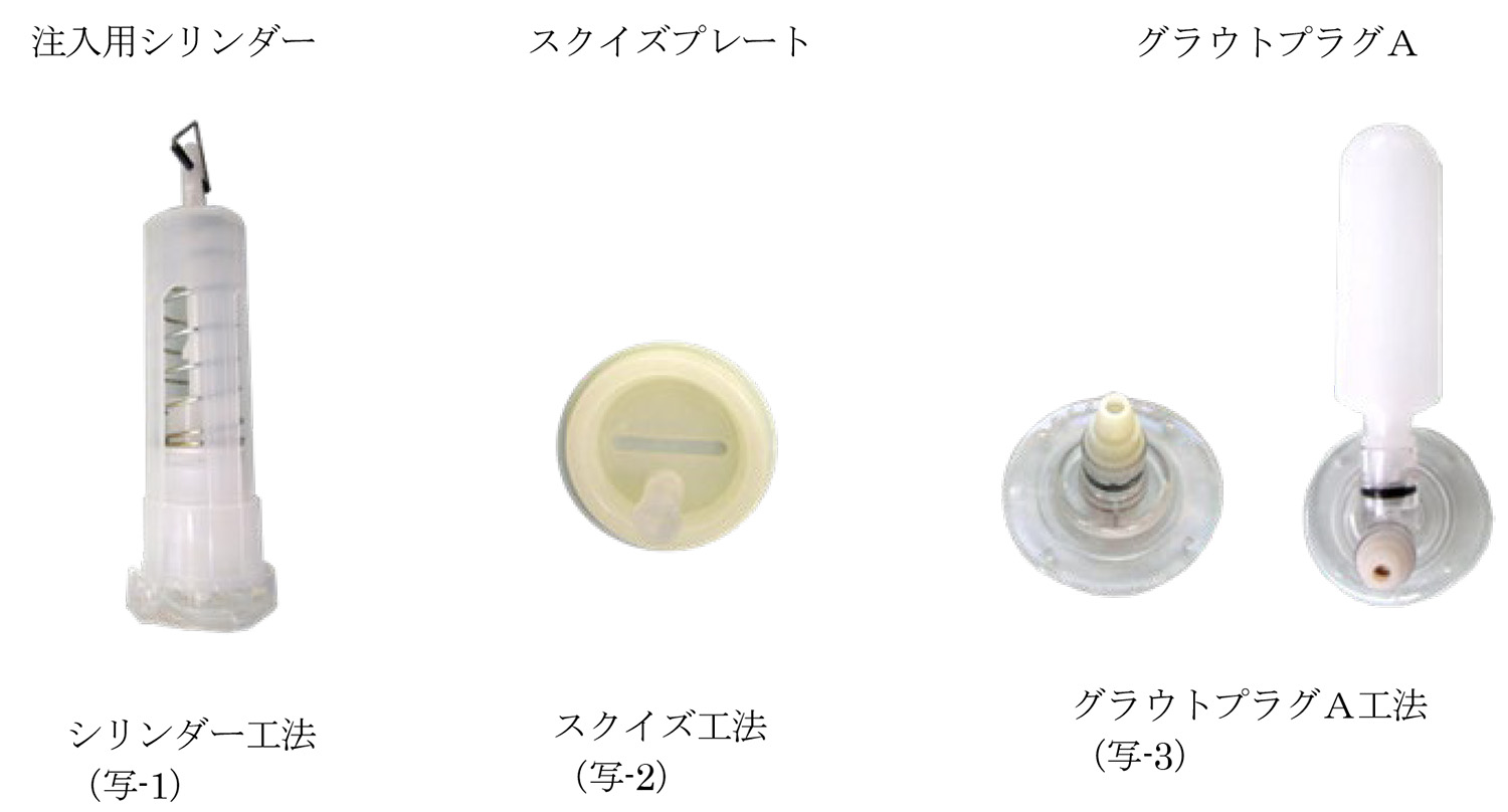スクイズ工法:ゴム膜と固定枠からなる、注入治具(スクイズプレート(写―2))を用い、そのゴム膜の復元力を利用して、低圧で自動的に注入する工法。