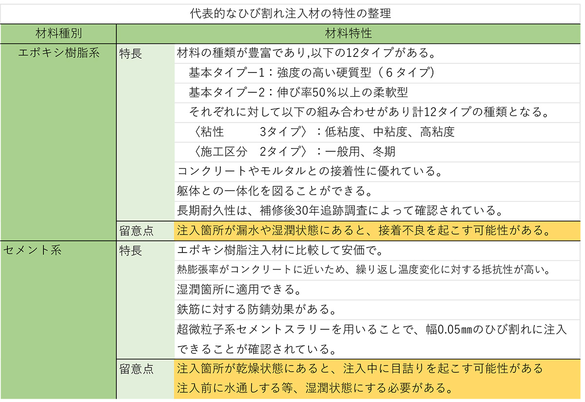 ひび割れ注入材は、現在の主流となっている有機系材料のエポキシ樹脂系と、無機系材料に分類される、セメント系の2種類に大別される。下表に、それぞれの特長と留意点について整理した。情報は2013年度の調査結果にもとづくものである。