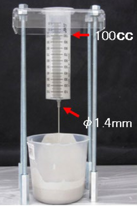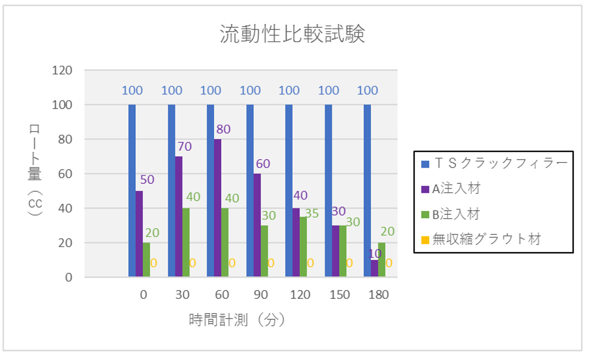 流動性の確認には写真1のTS式ロート試験器(注射器容量:100cc、吐出口径φ1.4㎜)を製作し実験は、30分毎の流下量と流下時間を3時間計測しました。結果、TSクラックフィラー®は3時関後も100cc全ての材料が流下しましたが、A注入材、B注入材は100㏄全ての流下には至らず、練り混ぜから60分を境に増粘し流動性が著しく低下した。また無収縮グラウト材は、練上り直後の計測時点においても流下には至りませんでした。