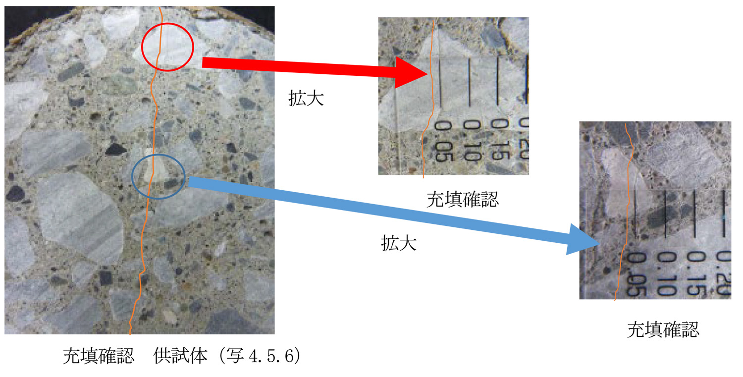供試体(φ100×H200)に円柱縦方向に圧縮試験機を用いて任意の幅(0.2㎜)のクラックを発生させ、円柱天端部に注入口を、下部の両端部にエアー抜き口を設け、その他のクラック開口部をセメント系材料でシーリングした。シーリングが硬化した後、TSクラックフィラー®を標準配合(W/C57%)で注入し、注入材料硬化後に供試体を切断した結果、幅0.05mm以下に至る注入材の充填を確認しました。(写真4.5.6)