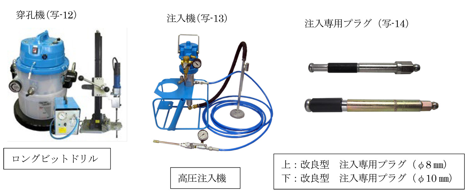 穿孔するにあたり、小口径深穴穿孔機(ロングビットドリル(写-12)による穿孔(φ9mm・φ15.5㎜)で高圧注入機(写-13)と注入専用プラグ(写-14)を使用して内部の補修及び補強を行う。