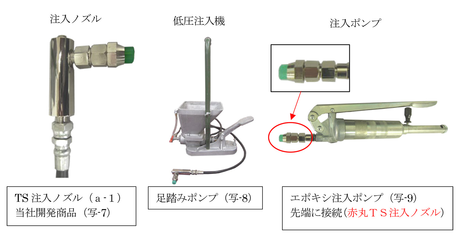 注入機:足踏みポンプ(写-8)エポキシ注入ポンプ(写-9)を先端変更により使用可能である。