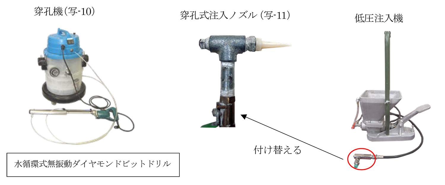穿孔径はφ4㎜~φ5㎜で水循環式無振動ダイヤモンドビットドリル(写-10)を使用して穿孔後、穿孔式注入ノズル(写-11)を差し込んで足踏みポンプにて注入する工法である。