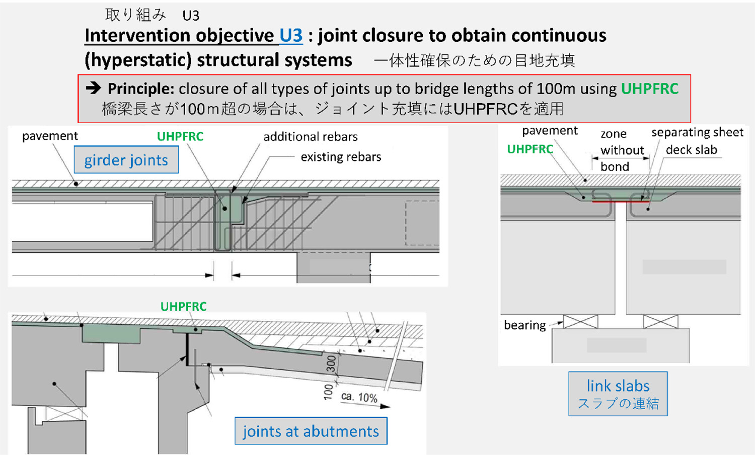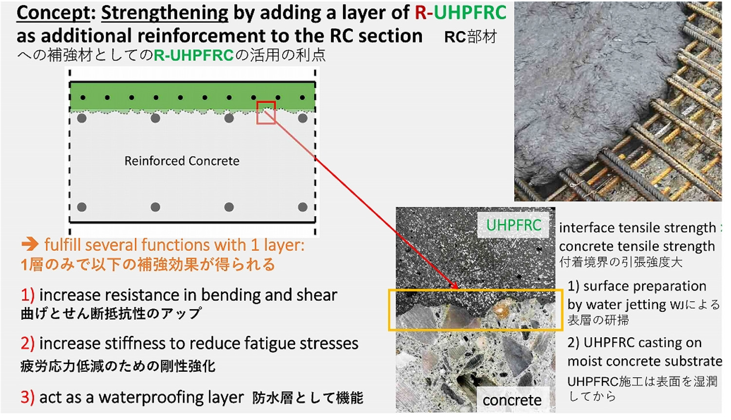 スイスのブリュービラー教授の講演には、聴講者らの熱い視線が注がれた。講演は英語であったが、予め筆者が講演資料に邦訳を併記しておいたので、おおかた理解は得られたはずである。その中で先生が最も強調されていたのは、床版増し厚として、鉄筋入りのR-UHPFRC補強を強調されていたことが印象に残った。日本ではまだまだUHPFRCのコストが高く、鉄筋入りだと増し厚量がかさみ、発注者は採用を見合わせてしまう。いかにしてR-UHPFRCのコストを下げられるかが今後の課題である。さらに、目地充填材としての活用も橋梁の寿命を延ばすツールである(図-31,32)