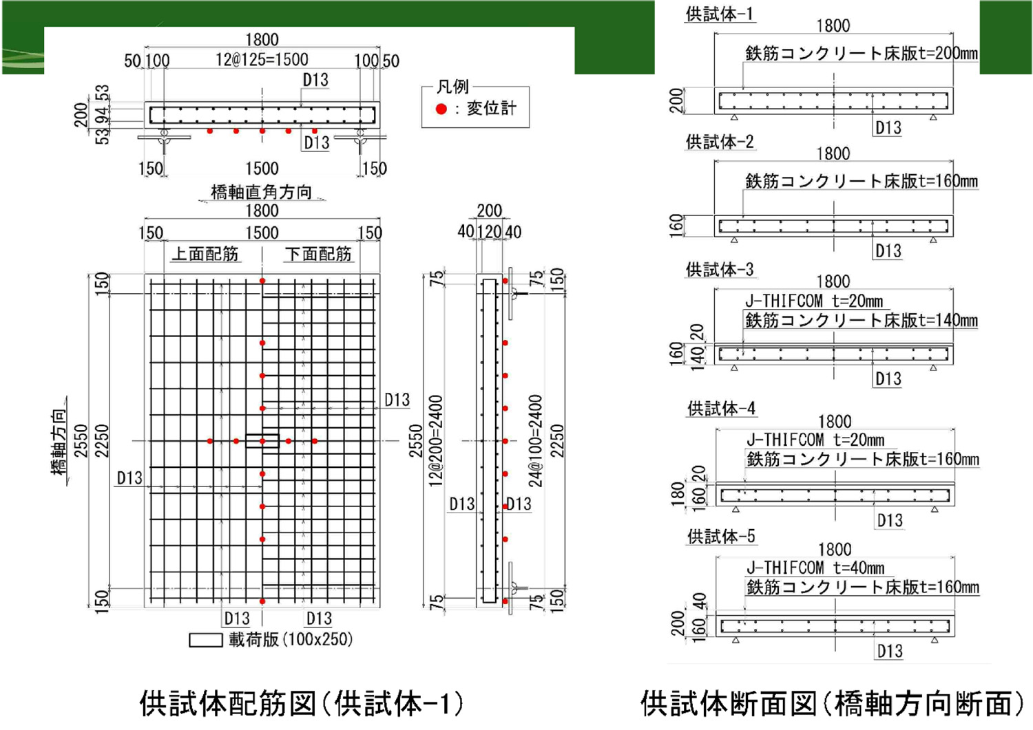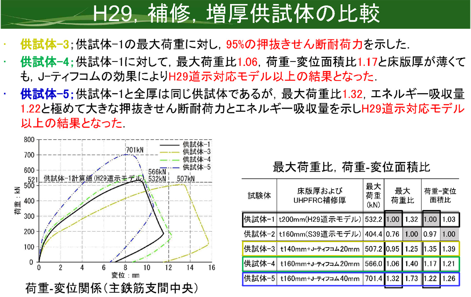 北海道大学の松本高志教授(J-ティフコム技術研究会会長)からは、RC床版の押し抜きせん断補強に関する研究成果が発表された。試験体は図-33に示す形状であり、供試体-2が昭和39年基準に準じた厚さ160mmの基本供試体(圧縮強度23.0N/mm2)、供試体-1は、平成29年基準に準じた厚さ200mmの供試体(圧縮強度28.2N/mm2)で、他は供試体-2を基本としている。試験結果(図-34,35)によれば、基本供試体を20mmはつって、J-ティフコムに置き換えることで、H29基準にかなり近づくことがわかる。