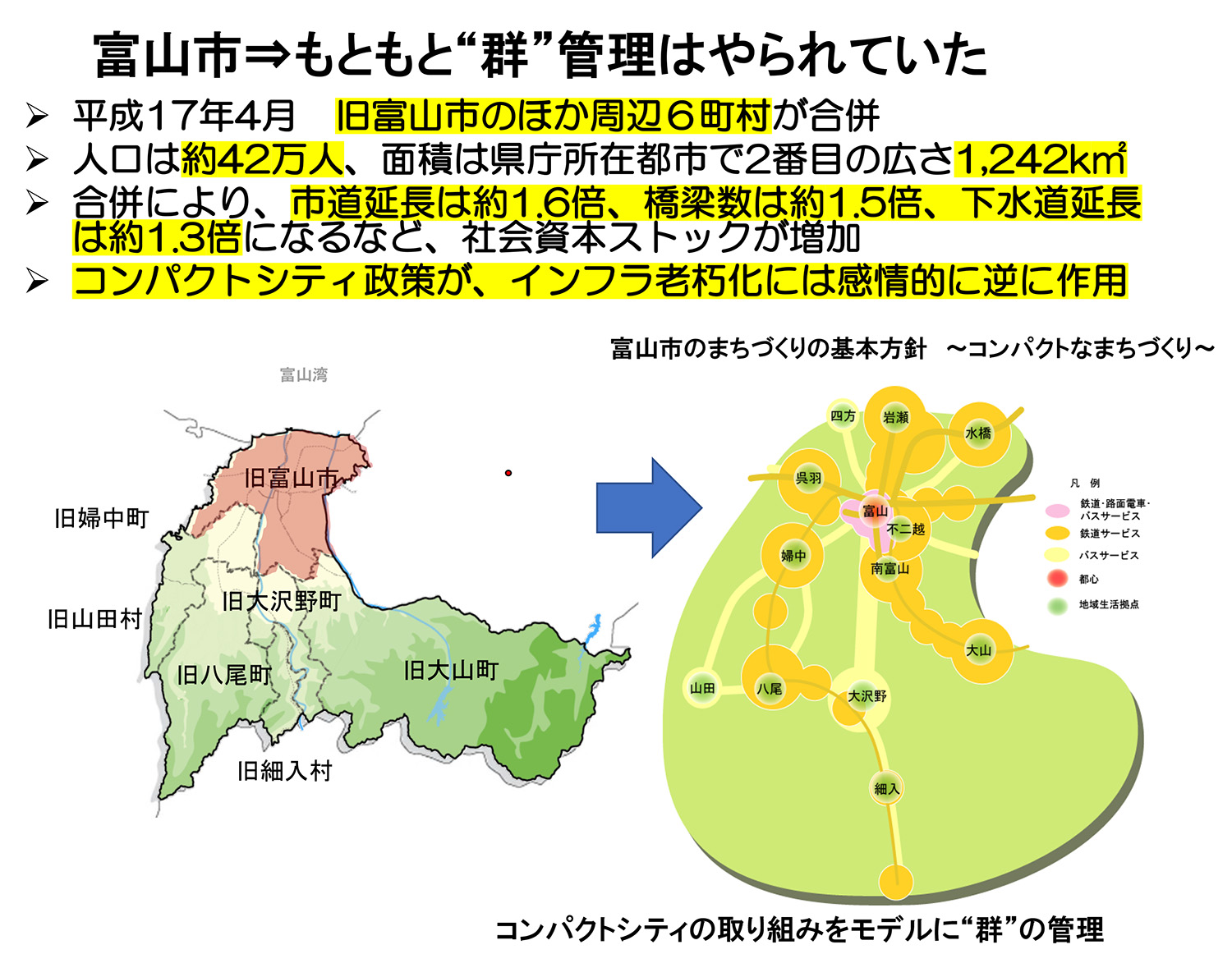 もう一つが「地域の群」であるが、これは難しい。地域性や住民性、文化などの様々な要素が作用する。私は、当初富山市周辺の市町村を一緒にやろうと考えていた。富山市長も、「広域で見てやれ」というので、富山県内の市長会や議長会で講演し、「もしよろしければ一緒に取り組みましょう」と提言したが、同調してはもらえなかった。それぞれの事情がある。しかし一番大きい要因は、市長、議員、職員のそれぞれのプライドだと思う。これに関しては半分あきらめている。歴史性、地域性、住民性で、これらが複雑に関与して、まとめられない場合がある。県や国の関与もある。なのでなかなか、まとまらない。本来はこれをまとめるのが政治家の仕事である。しかし、それぞれの都合でなかなかうまくはいかない。1市1町、状況は異なり、考え方も違うからである。どこも一緒と言うわけにはいかない。かつて平成の大合併と言う時にもうまくはいかなかったのがあらわしている。