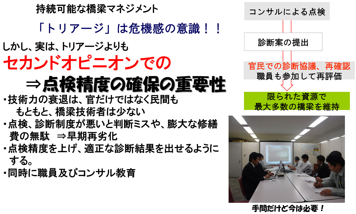富山市においては当初から「セカンドオピニオン」制度を導入して、全数の診断協議を行っている。これによって診断結果の精度も向上してきたし、平準化もなされてきた。次工程である補修への移行もスムーズに行っている。ただし予算の関係から、全てが実施できるわけではないのが実情であり。その辺は政治的理解が必要な部分であると思っている。