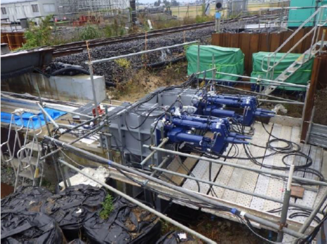 過去に多く行われている方法は、工事桁で軌道を受けておき、その下を掘削して橋台を造る方法です。地下水対策がコストをかけずに可能ならばこの方法でもよいでしょうが、地下水対策が必要になるとその工事費が大きくなり、コスト面で不利となることが多いです。