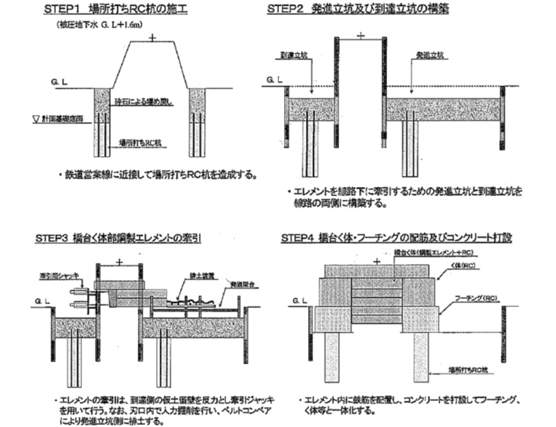 架け替えには架け替えには橋台、橋脚が先に施工されます。橋台の構造は、最近はJES橋台が増えています。JES橋台とは、線路下に角型鋼管(JESエレメント)を何段か差し込み、線路の外側に柱と基礎を造り一体化した門型の橋台です。基礎は線路外に施工でき、また桁を受ける梁は線路外から角型鋼管を挿入して造るので、列車への影響が少なく施工できるので、経済的にも、工期的にも優れています。図10に施工手順を示します。図11は橋台側面図です。横取り前に、線路下に橋台を造っておきます。