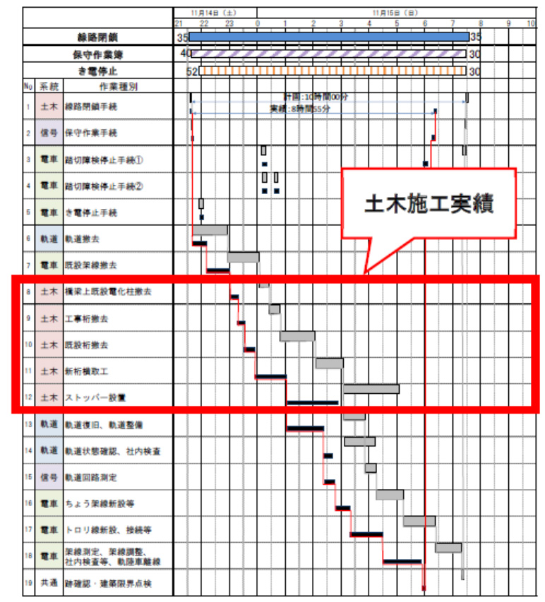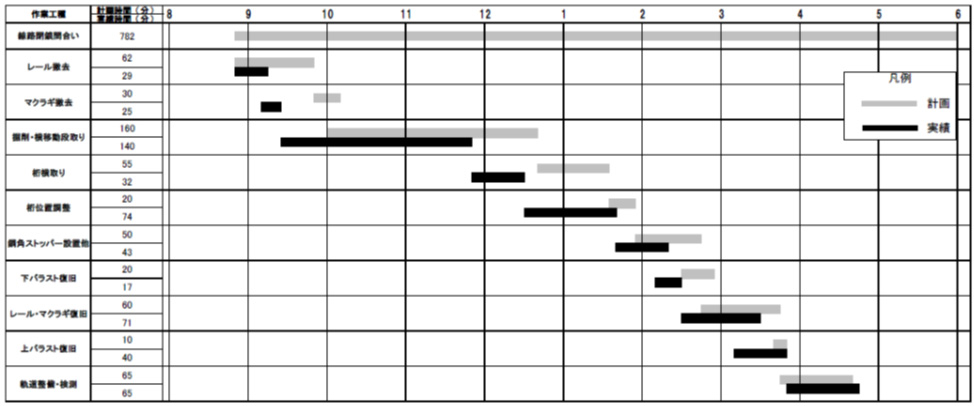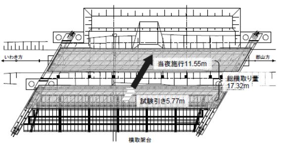 表1,2を見ると、桁の横取りの作業は1時間程度で終えています。事前のレール撤去や、既設桁の撤去、事後のレールの接続などは当日にやらざるを得ない作業です。その他の作業は横取り当日の作業時間が少ない時は、事前に準備するなどで対応することも必要となります。