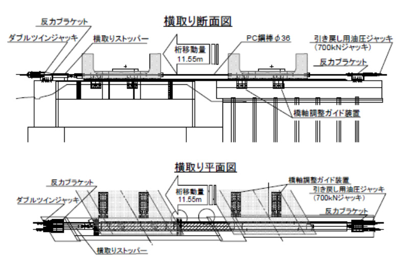 橋梁延長が短く、線路の線形を変えないで橋梁のスパンを大きくする場合は多くは、活線施工での横取り工法が採用されます。現在の橋梁の隣に新設の橋梁を造り、列車の通らない数時間を確保して、在来の橋梁の撤去と、新設の橋梁の架設を行う方法です。隣に造った橋梁を横に動かして、本来の位置に据え付ける方法です。滑らす方法はPTFE(テフロン)板付きのゴムシューをステンレス板や、クロムメッキした鋼板の上に置き、その上に桁を載せてジャッキで動かすことが多く行われています。今はダブルツインジャッキで、連続的に移動させることができます。PTFE板付きのゴムシューはそのまま本設のシューとします。水平移動防止装置は別途施工します。