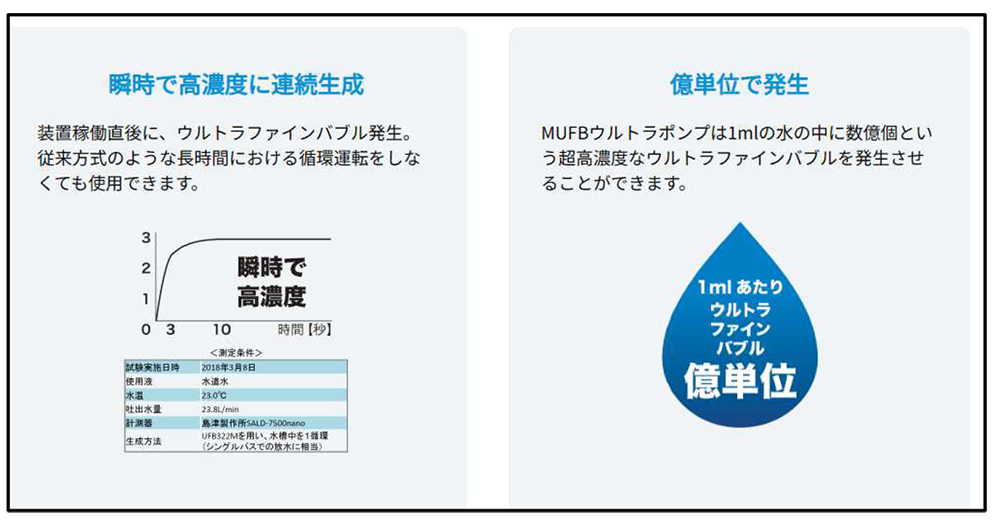 M社が公開しているHPにおいて、自社が製造・販売する複数のUFB生成装置説明には、図‐8に示すように、「瞬時で高濃度に連続生成」と「億単位で生成」が装置の特徴として明記され、装置カタログにも同様な記載がある。