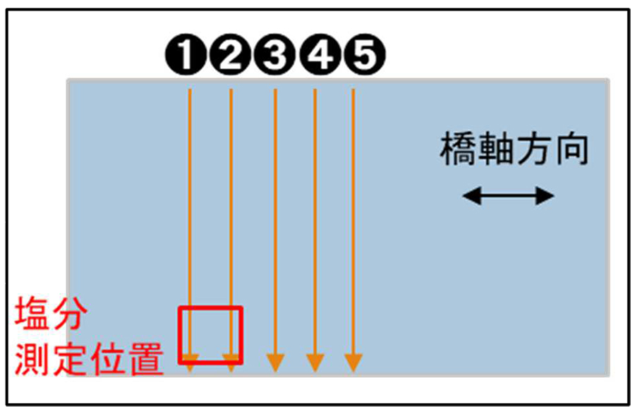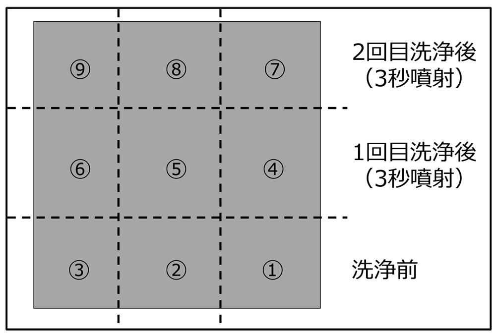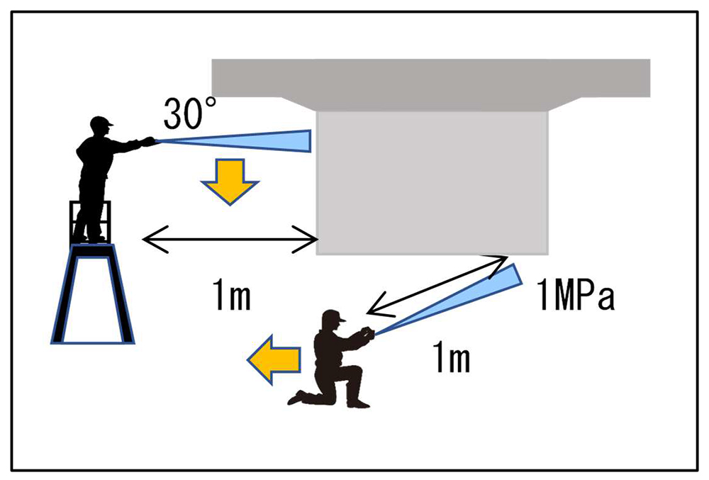 洗浄条件は、洗浄面までの離隔距離を1.0m,吐出圧を1.0MPa、噴射角を30°とすべて共通で行っている。なお、事前に行った試験鋼板を使用した試験施工において、噴射角10°と30°洗浄効果に大きく差異が無かったことから施工効率がより良い噴射角30°を選定している。洗浄方法は、1.0m幅を5分割し、5ラインを1回として1回終了ごとに1ラインごとの付着塩分量計測を行った。なお、1ラインの洗浄時間は5秒間としている。