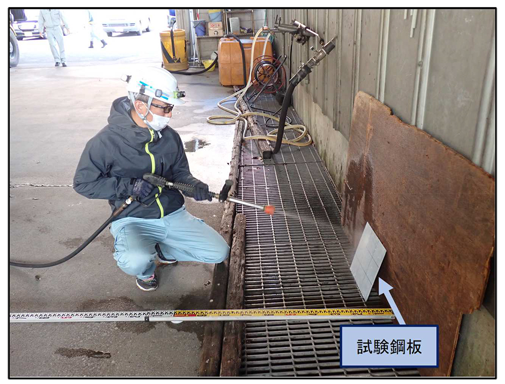 試験鋼板を対象とした試験施工結果から言えることは、UFB水(希釈無し)、UFB水(2倍希釈)、一般水の洗浄効果は、想定した通りの結果とはならなかった。しかし、吐出圧力、噴射角、洗浄時間(濡れ時間)の結果はおおむね想定通りの結果となった。