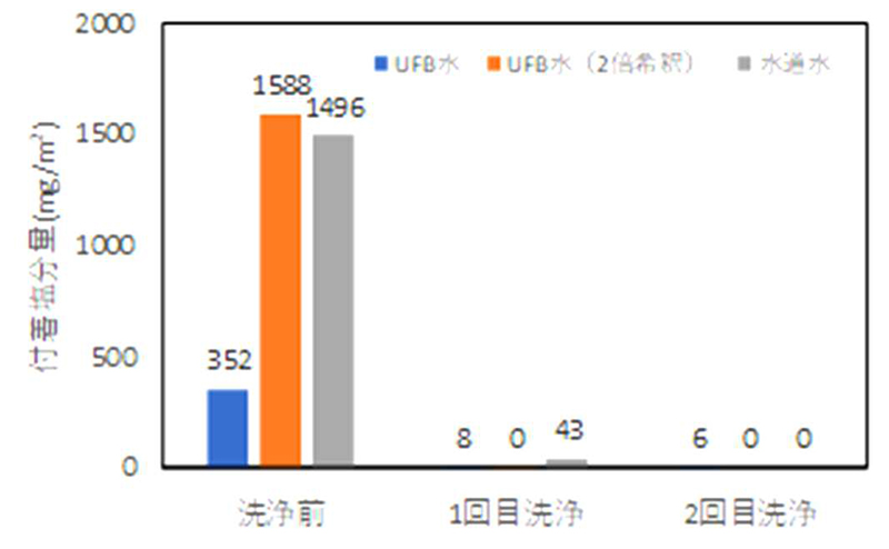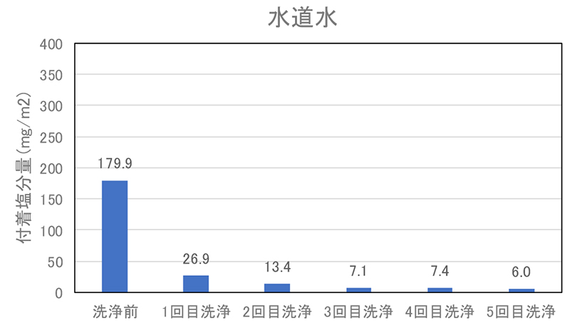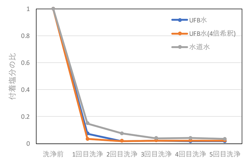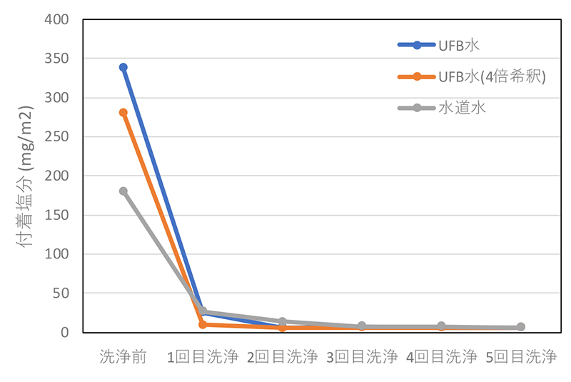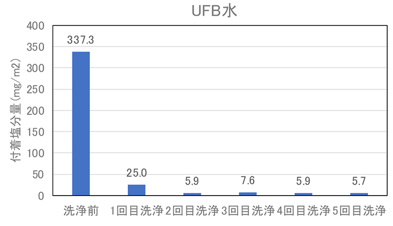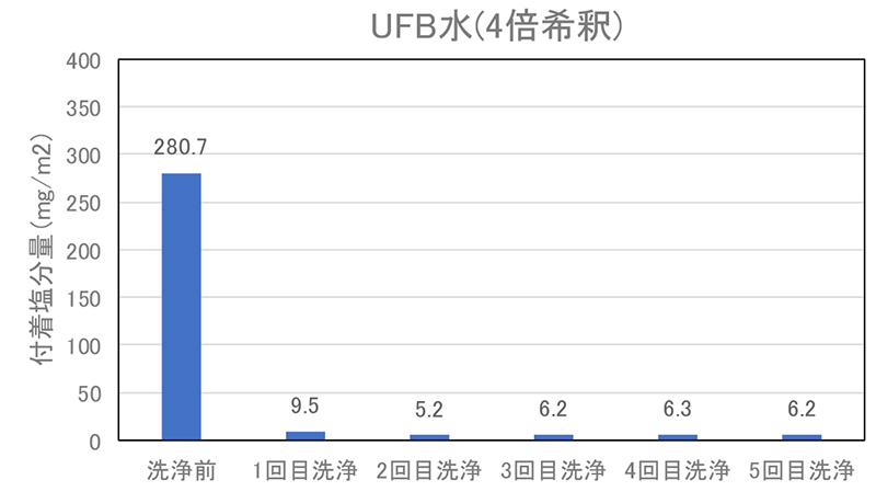 4倍希釈のUFB水による試験結果は、洗浄前が280.7 mg/㎡、第1回目終了時9.5 mg/㎡、第2回目終了時5.2 mg/㎡、第3回目終了時6.2 mg/㎡、第4回目終了時6.3 mg/㎡、第5回目終了時6.2 mg/㎡と1回目で塩分除去率96.6%とUFB水より塩分除去率は高かったが、UFB水と同様にその後は横ばい状態で完全除去とはなっていない。
